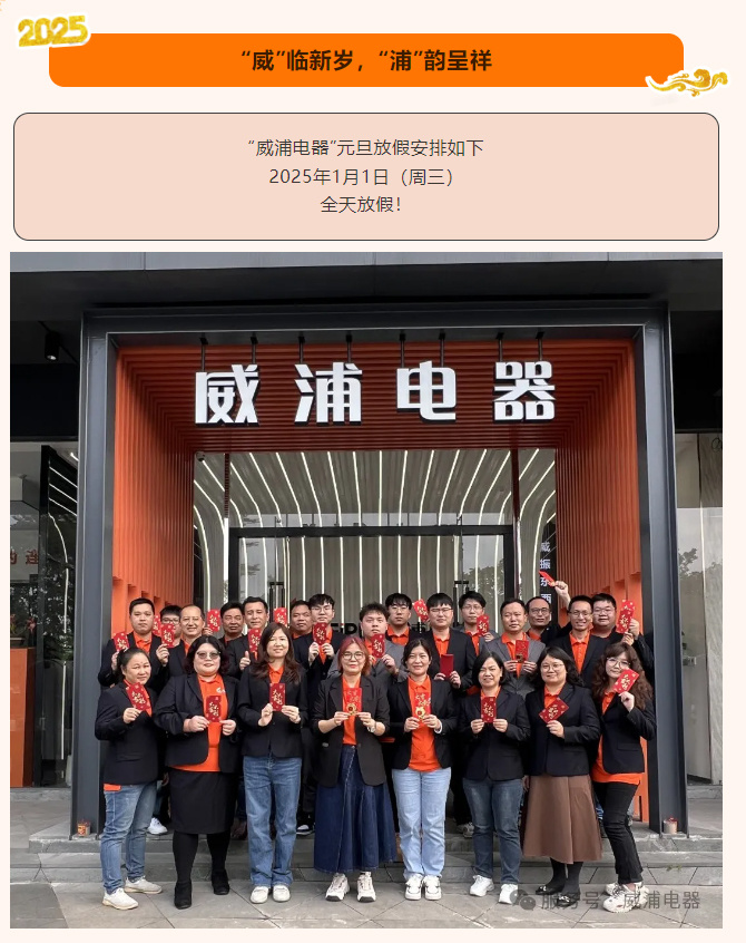 值此 2025 年元旦的曙光初照之际,“威浦电器”怀着满腔热忱,向每一位辛勤耕耘的员工、每一位信赖相伴的合作伙伴,以及所有关注支持我们的朋友们,献上最衷心的节日祝贺与最温暖的新年祈愿!